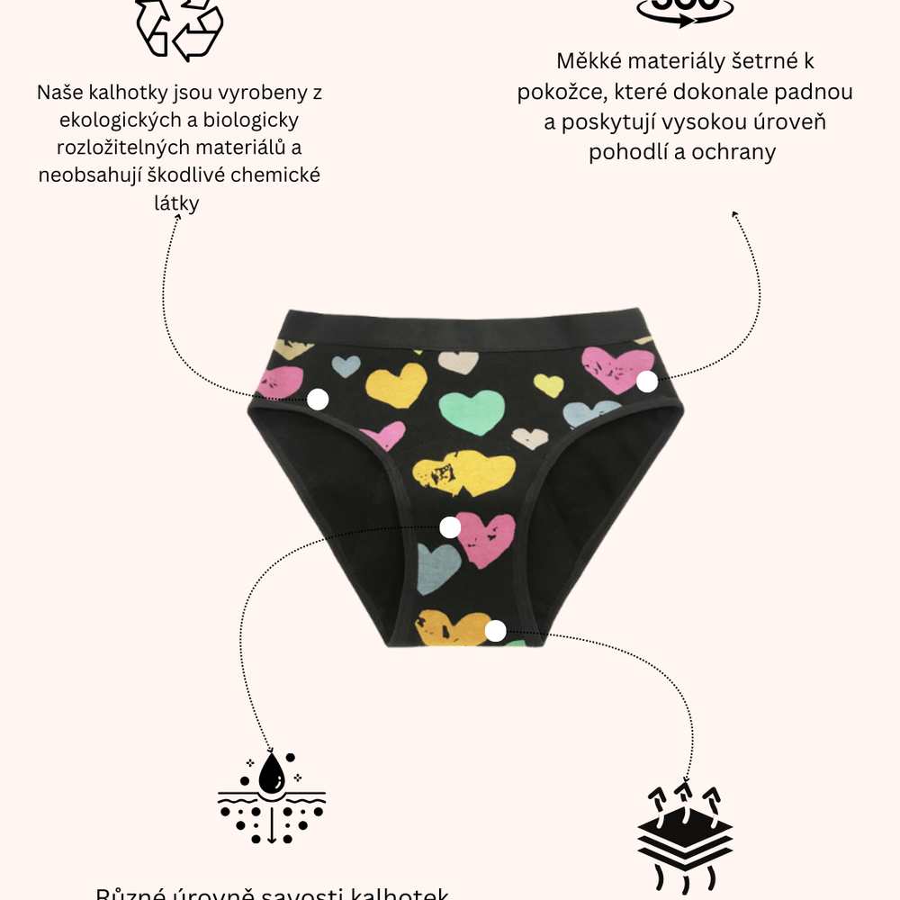 Použití sušičky může poškodit absorpční část menstruačních kalhotek, proto doporučujeme sušit je na vzduchu nebo na radiátoru.